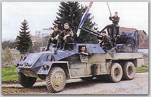 | .....Существовал удивительный броневик под именем «Бобич». Это был обшитый броневыми листами грузовик FАР 13, в кормовой части которого стояла 76-мм горная пушка М-48 «Тито» (короткоствольное орудие югославской конструкции, силуэтом напоминающее советскую «полковушку» обр. 1943 г.; производилась фабрикой «Братство»). Пушка предназначалась только для навесной стрельбы. На «морде» «Бобича» висела счастливая подкова, а на борту красовался Крест св. Саввы - символ Сербства: равносторонний крест с четырьмя буквами «С» в углах, которые служат сокращением изречения небесного покровителя Сербии: «Только единство спасет сербов» («Само слога Србинаспашава»). Еще один «бывший» FАР получил «на спину» две ракеты класса «воздух-воздух» К-13, когда-то составлявшие подвесное вооружение МиГ-21. |