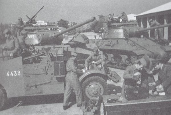"Namontirana" scena koja prikazuje rad na odrzavanju primljene tehnike. U prvom planu izvidj. automobil M-3 Skautkar, iza dve samohotke M-36B2
